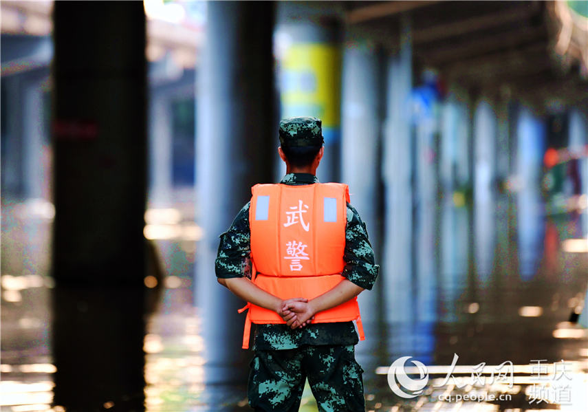 8月18日,武警官兵在重慶渝中區(qū)菜園壩水果市場附近觀察水位。郭傳伍攝