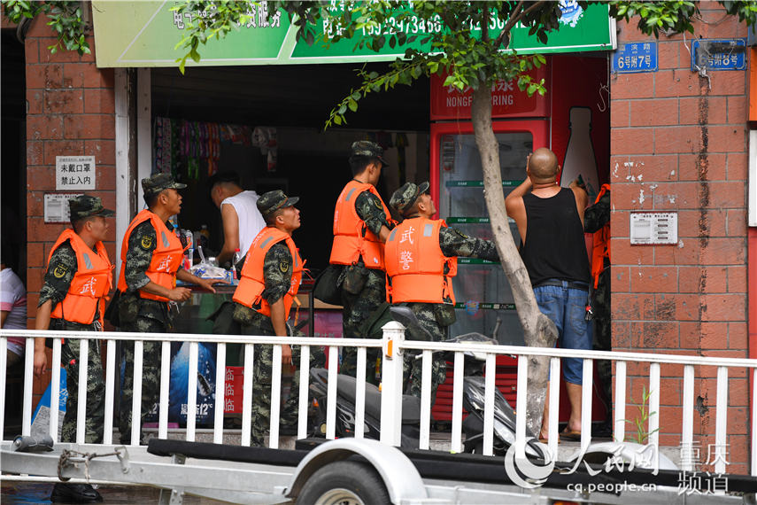 8月18日,武警官兵在重慶巴南區(qū)魚洞街道幫助群眾搶運(yùn)物資。郭傳伍攝
