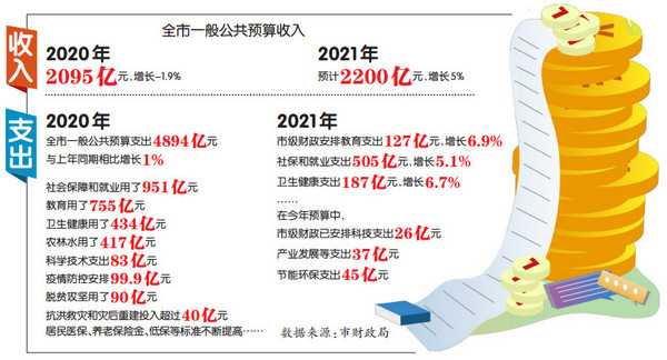 根據(jù)報告,2020年全市一般公共預(yù)算支出4894億元、與上年同期相比增長1%。從具體花銷看:社會保障和就業(yè)用了951億元,教育用了755億元,衛(wèi)生健康用了434億元,農(nóng)林水用了417億元,科學(xué)技術(shù)支出83億元,疫情防控安排99.9億元,脫貧攻堅用了90億元,抗洪救災(zāi)和災(zāi)后重建投入超過40億元,居民醫(yī)保、養(yǎng)老保險金、低保等標(biāo)準(zhǔn)不斷提高。