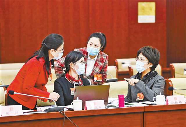全國(guó)政協(xié)委員、重慶靜昇律師事務(wù)所主任律師彭靜(右二)與婦聯(lián)界別委員一起討論提案。(市政協(xié)辦公廳供圖)