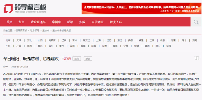 人民網(wǎng)重慶12月5日電 (陳琦)“感謝歇臺(tái)子派出所為我順利辦完落戶手續(xù),讓一名軍轉(zhuǎn)干部剛回地方就感受到了滿滿的暖意,也為重慶的窗口辦事形象點(diǎn)贊!”近日,一網(wǎng)友通過(guò)“領(lǐng)導(dǎo)留言板”給重慶市市長(zhǎng)留言表達(dá)感謝。感謝信中同時(shí)提到,辦事窗口為方便群眾應(yīng)添置復(fù)印設(shè)施的建議,也得到了圓滿解決。