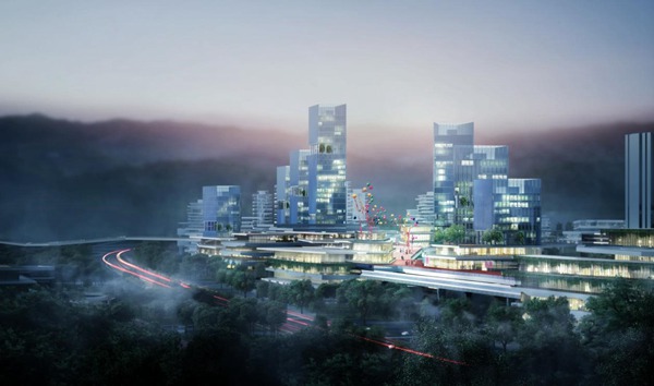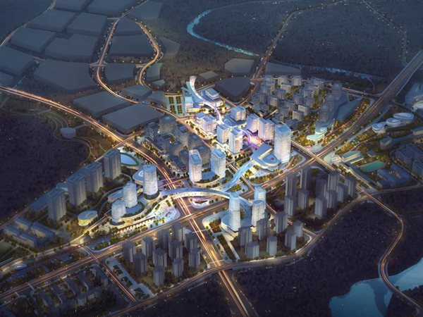 空間上構(gòu)建4公里長的綠廊慢行系統(tǒng),形成聚集各種公共設(shè)施的“智慧中樞”。在三線交匯樞紐上以“聚能云環(huán)”,串聯(lián)包含大數(shù)據(jù)企業(yè)總部、五星級酒店、萬物互聯(lián)科技館等,打造 “創(chuàng)智中樞城”。