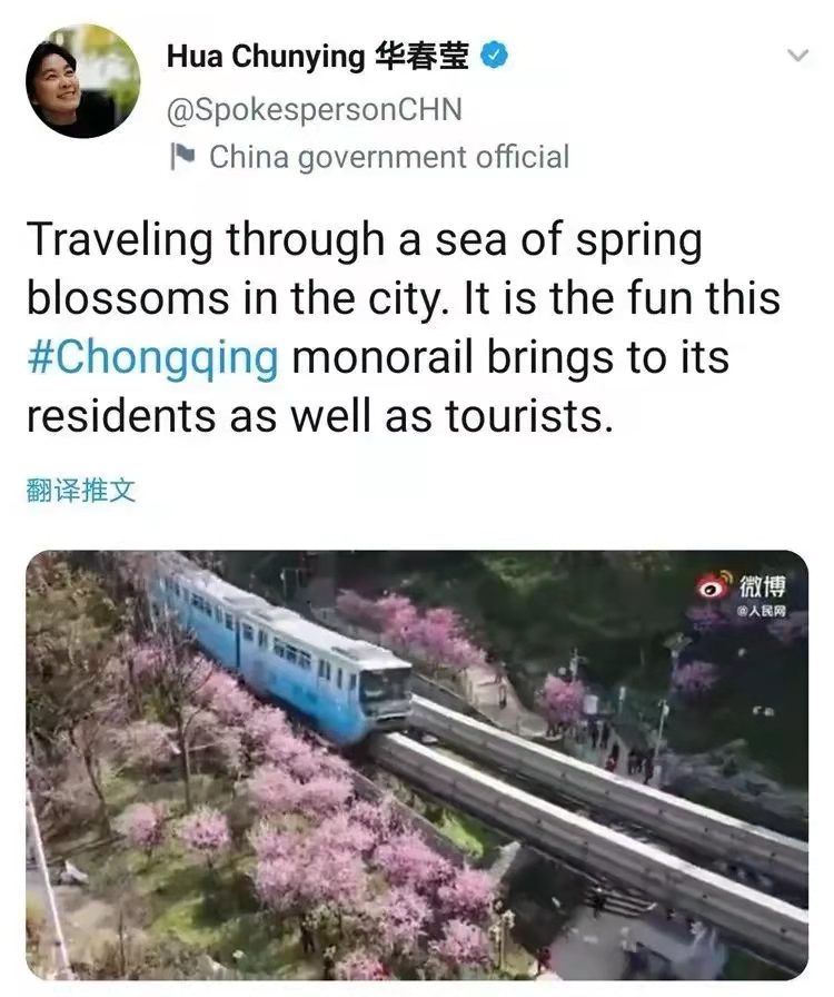 2月的重慶,春暖花開,萬物復(fù)蘇,重慶軌道交通二號線佛圖關(guān)段的美人梅又開了,許多游客迎著春風(fēng),來此賞花踏青。去年,人民網(wǎng)重慶頻道、重慶發(fā)布策劃拍攝制作的原創(chuàng)視頻和組圖“開往春天的列車”一經(jīng)發(fā)布,火爆全網(wǎng),華春瑩也發(fā)推文點贊。