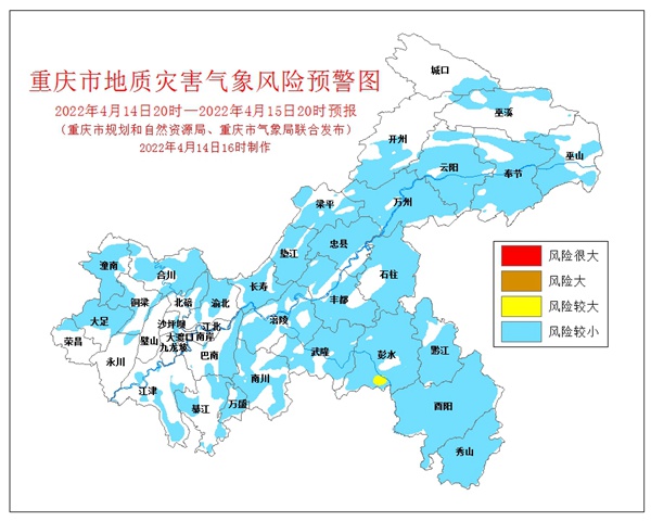 4月14日16時(shí),重慶市規(guī)劃和自然資源局、重慶市氣象局聯(lián)合發(fā)布全市地質(zhì)災(zāi)害氣象風(fēng)險(xiǎn)預(yù)警。