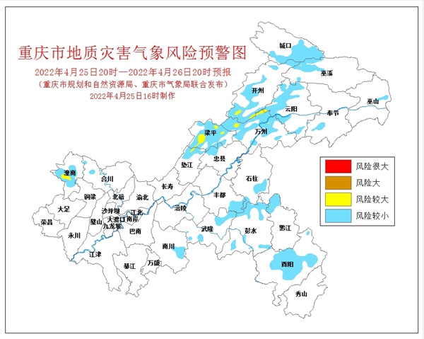 4月25日20時(shí)至4月26日20時(shí),潼南區(qū)、墊江縣、梁平區(qū)、萬(wàn)州區(qū)、開州區(qū)、云陽(yáng)縣屬于風(fēng)險(xiǎn)較大地區(qū),地質(zhì)災(zāi)害氣象風(fēng)險(xiǎn)等級(jí)為三級(jí)(黃色預(yù)警),合川區(qū)、南川區(qū)、豐都縣、石柱縣、忠縣、巫山縣、巫溪縣、奉節(jié)縣、城口縣、武隆區(qū)、黔江區(qū)、彭水縣、酉陽(yáng)縣屬于風(fēng)險(xiǎn)較小地區(qū),地質(zhì)災(zāi)害氣象風(fēng)險(xiǎn)等級(jí)為四級(jí)(藍(lán)色預(yù)警),請(qǐng)相關(guān)區(qū)縣注意防范。(唐鑫)