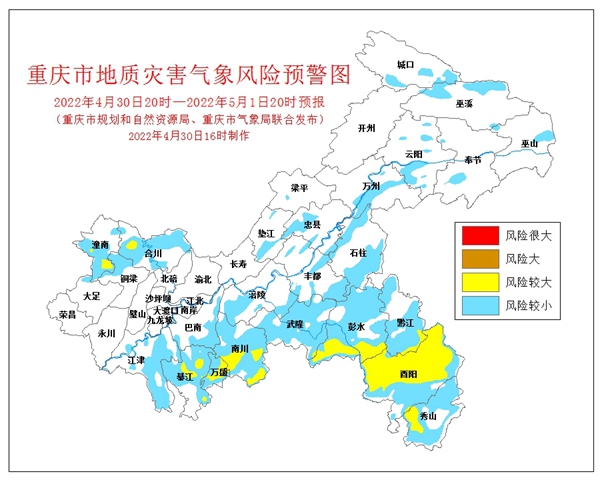 4月30日16時(shí),重慶市規(guī)劃和自然資源局、重慶市氣象局聯(lián)合發(fā)布全市地質(zhì)災(zāi)害氣象風(fēng)險(xiǎn)預(yù)警。