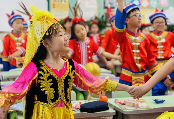 講臺上,老師們結合圖片視頻繪聲繪色地給學生們講解著各民族的特色和習俗,校園里的孩子們也穿著色彩斑斕、風格各異的民族服飾暢游在校園的各個角落,參加民族知識競賽、民族才藝展示、班級游園、勞動比賽、課本劇表演等。