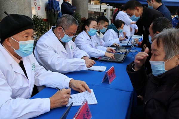 饒家濟(jì)(左一)為群眾提供義診服務(wù)。巫山縣中醫(yī)院供圖