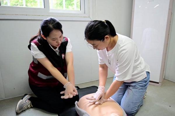 在理論授課的同時(shí),急救培訓(xùn)老師姜莉和張立結(jié)合理論授課的內(nèi)容現(xiàn)場(chǎng)進(jìn)行示范性操作,通過對(duì)“模擬人”實(shí)施心臟復(fù)蘇搶救操作進(jìn)行了演示,包括判斷是否喪失意識(shí)、有無自主呼吸、有無脈搏,進(jìn)行胸外心臟按壓、清理口腔異物、開放氣道、人工呼吸等操作要領(lǐng)的示范。