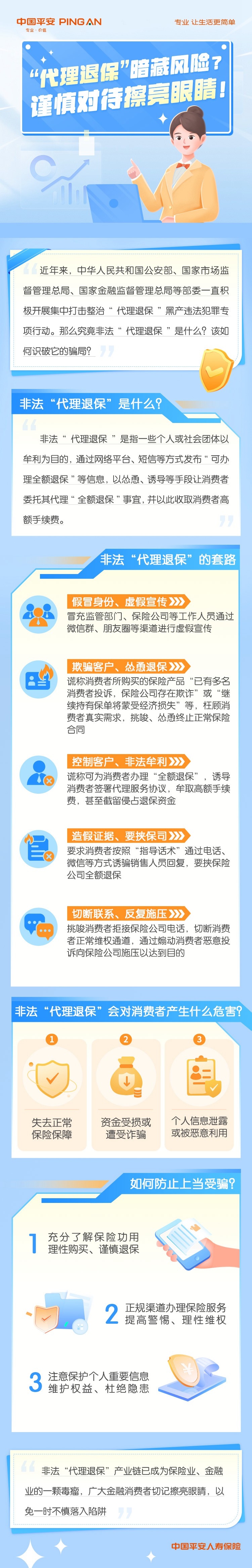 近年來,國家一直積極開展集中打擊整治“代理退?!焙诋a(chǎn)違法犯罪專項行動。那么,究竟非法“代理退保”是什么?該如何識破它的騙局?2023年“金融消費者權(quán)益保護教育宣傳月”活動期間,平安人壽重慶分公司面向廣大市民朋友推出“金融消費者權(quán)益保護教育宣傳月”消保知識小課堂系列。本期分享主題為:《“代理退保”暗藏風(fēng)險 謹(jǐn)慎對待擦亮眼睛》。(平安人壽重慶分公司)