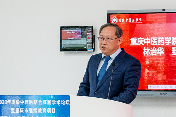 重慶中醫(yī)藥學(xué)院副院長林治華致辭。重慶市璧山區(qū)中醫(yī)院供圖