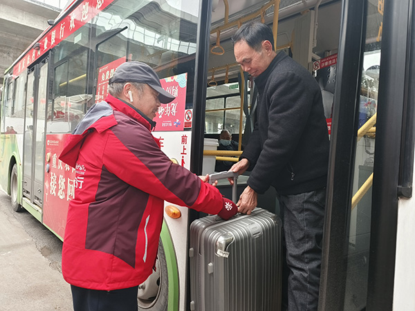 重慶農(nóng)商行云陽支行志愿者為務(wù)工返鄉(xiāng)人員安排轉(zhuǎn)運(yùn)大巴、搬運(yùn)行李。重慶農(nóng)商行供圖