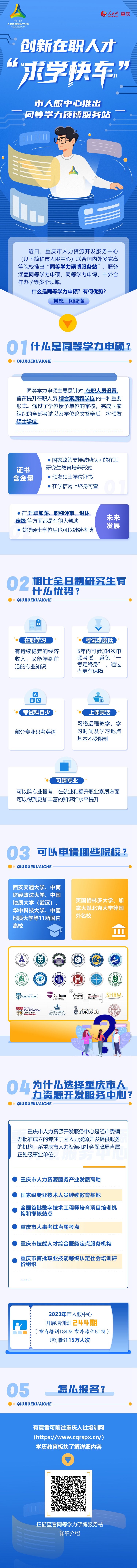 近日,重慶市人力資源開發(fā)服務中心(以下簡稱市人服中心)聯(lián)合國內(nèi)外多家高等院校推出“同等學力碩博服務站”,服務涵蓋同等學力申碩、同等學力申博、中外合作辦學等多個領(lǐng)域。