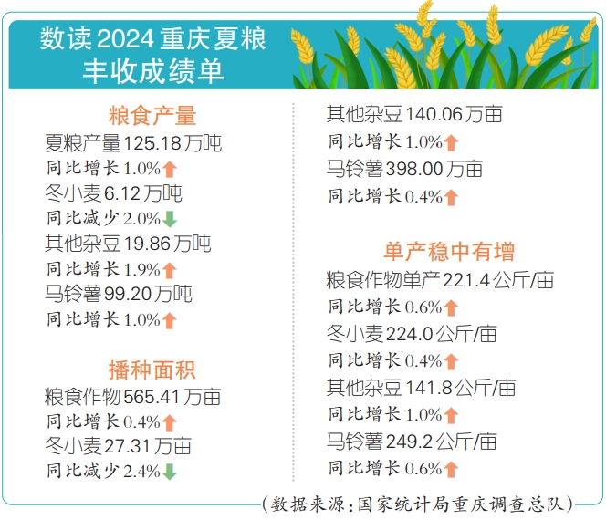 國家統(tǒng)計(jì)局重慶調(diào)查總隊(duì)近日發(fā)布的數(shù)據(jù)顯示,今年我市夏糧播種面積達(dá)565.41萬畝,產(chǎn)量125.18萬噸,夏糧實(shí)現(xiàn)面積、產(chǎn)量“四連增”,夏收糧食再獲豐收。