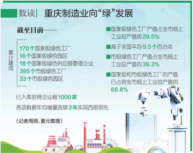 當(dāng)前,重慶把綠色制造體系建設(shè)納入“33618”現(xiàn)代制造業(yè)集群體系和“416”科技創(chuàng)新布局加以推進(jìn),強(qiáng)化數(shù)字技術(shù)、綠色技術(shù)應(yīng)用,迄今已建成170個(gè)國(guó)家級(jí)綠色工廠、16個(gè)國(guó)家級(jí)綠色園區(qū),工業(yè)“含綠量”連續(xù)3年西部領(lǐng)先,工業(yè)綠色低碳發(fā)展成效凸顯。