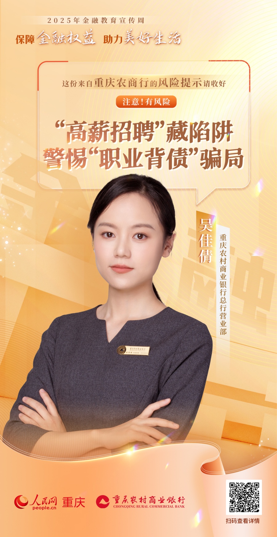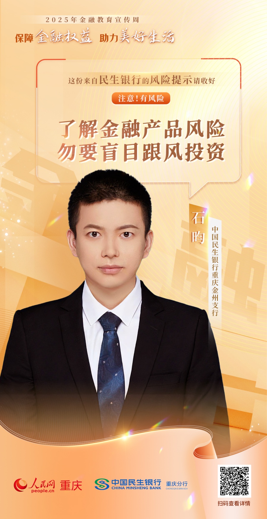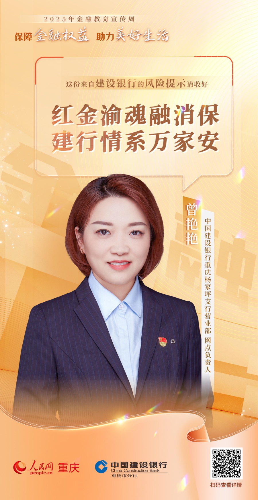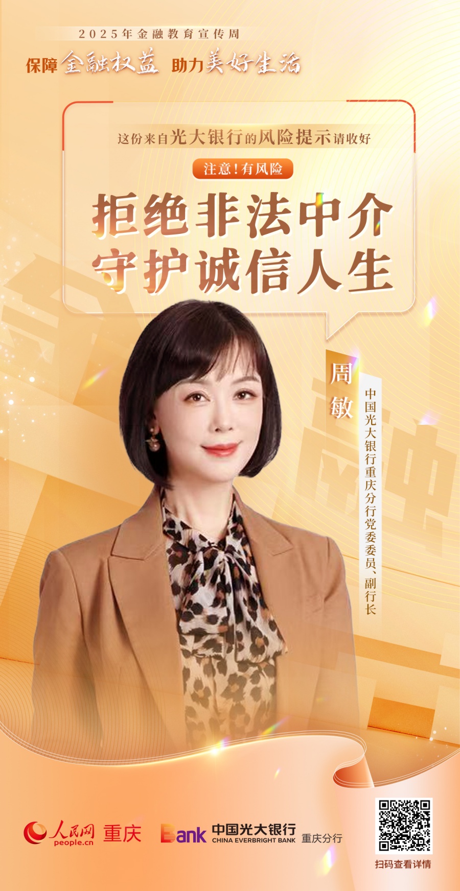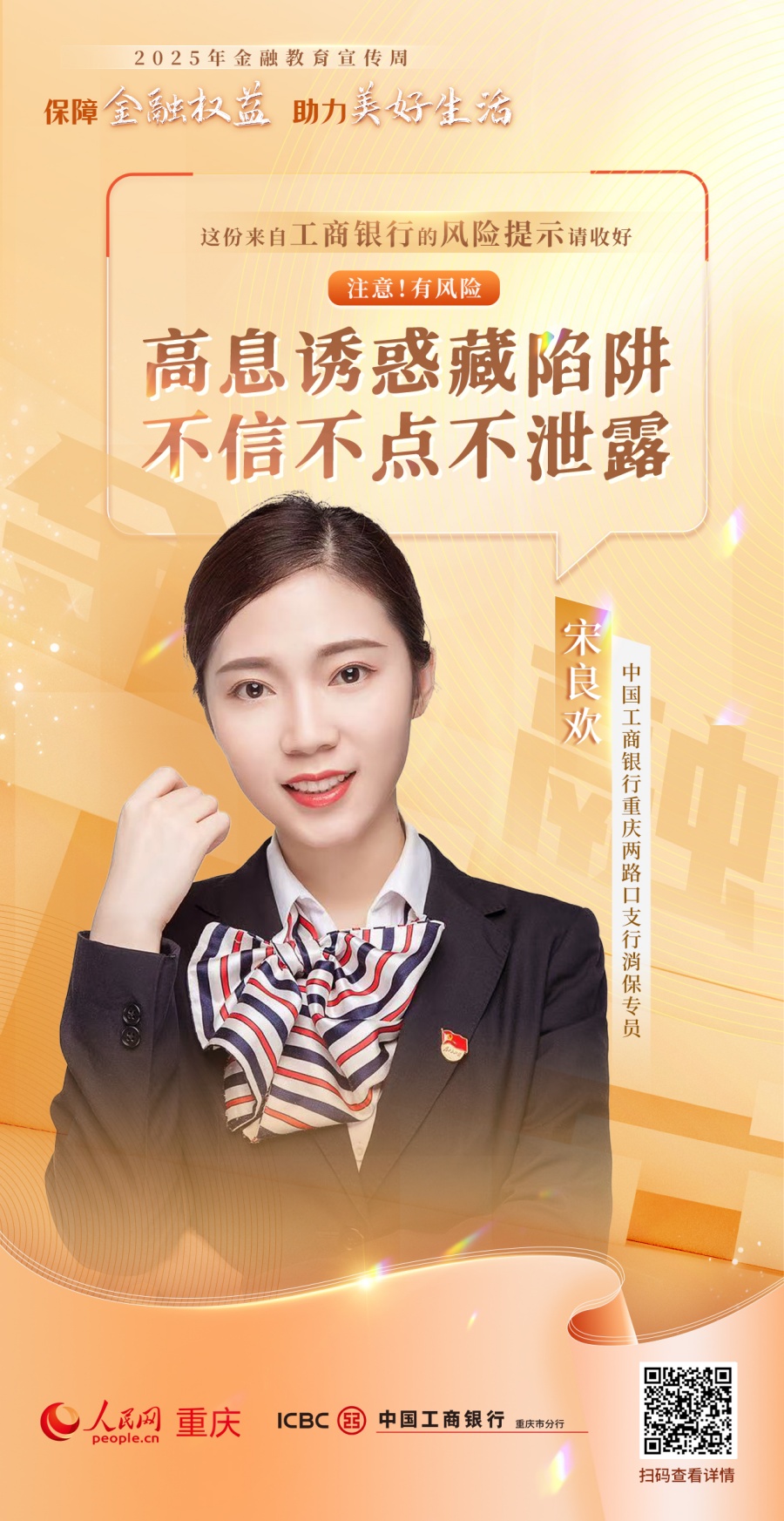 人民網(wǎng)重慶頻道聯(lián)動(dòng)重慶25家金融機(jī)構(gòu),推出“注意!有風(fēng)險(xiǎn)”系列公益海報(bào),面向廣大金融消費(fèi)者普及金融知識(shí),提示金融風(fēng)險(xiǎn),倡導(dǎo)理性消費(fèi),助力市民守護(hù)財(cái)產(chǎn)安全、樹(shù)立正確金融消費(fèi)觀念。(游晉宇、鄒雨璠)