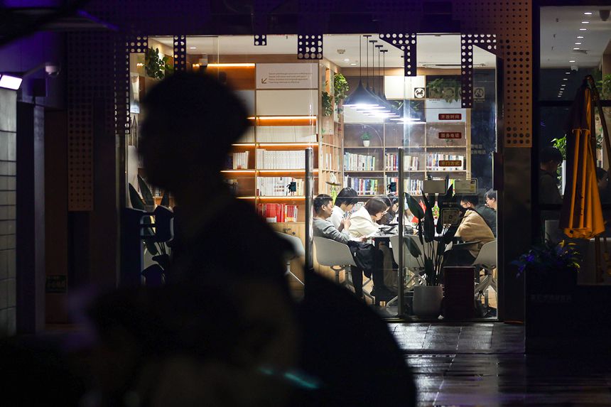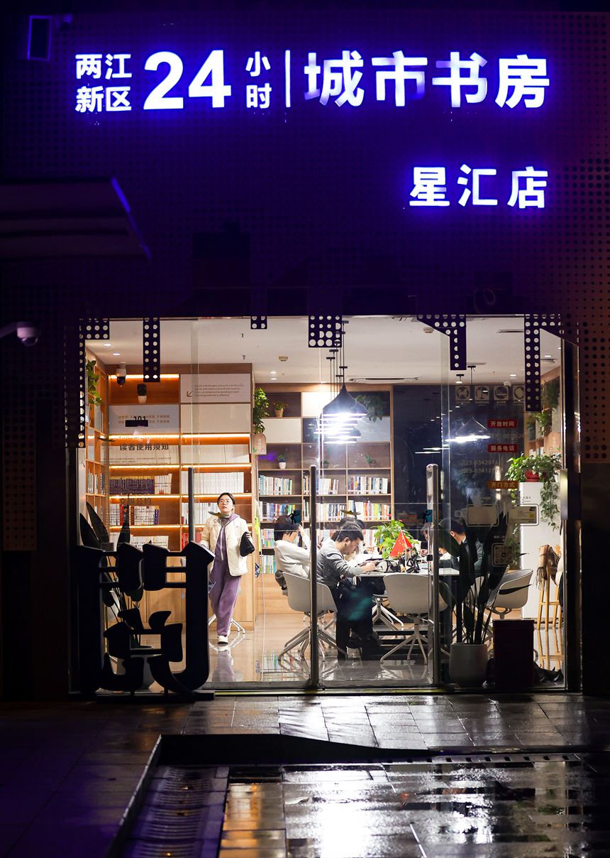 夜幕下,重慶兩江新區(qū)24小時城市書房燈火通明。這里藏書豐富、溫暖舒適,并全天候向市民開放,為上班族、學(xué)生、研學(xué)愛好者等提供深夜閱讀空間。不打烊的書香,既滿足市民多元閱讀需求,也為城市添了份溫暖文化底色。(記者 尹詩語)